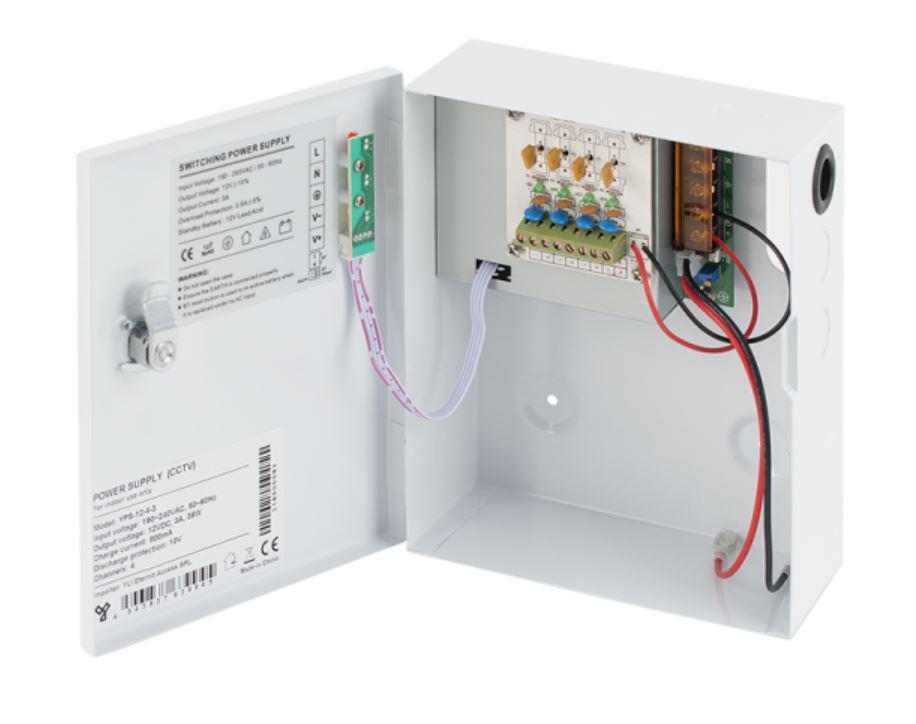 Sursa cu backup, 4 canale, comutatie, Tensiune de intrare: 190-265Vca, 50-60Hz, Tensiune de iesire: 13.8Vcc ±2%, 3A, loc pentru acumulator 12V/7Ah( nu este inclus), Protectie la scurtcircuit, supratensiune sau suprasarcina prin termistoare PTC, separat pentru fiecare canal; LED stare pe fiecare canal, Material carcasa: metal vopsit alb, Dimensiuni: 163(l) x 202(H) x 75(A)mm