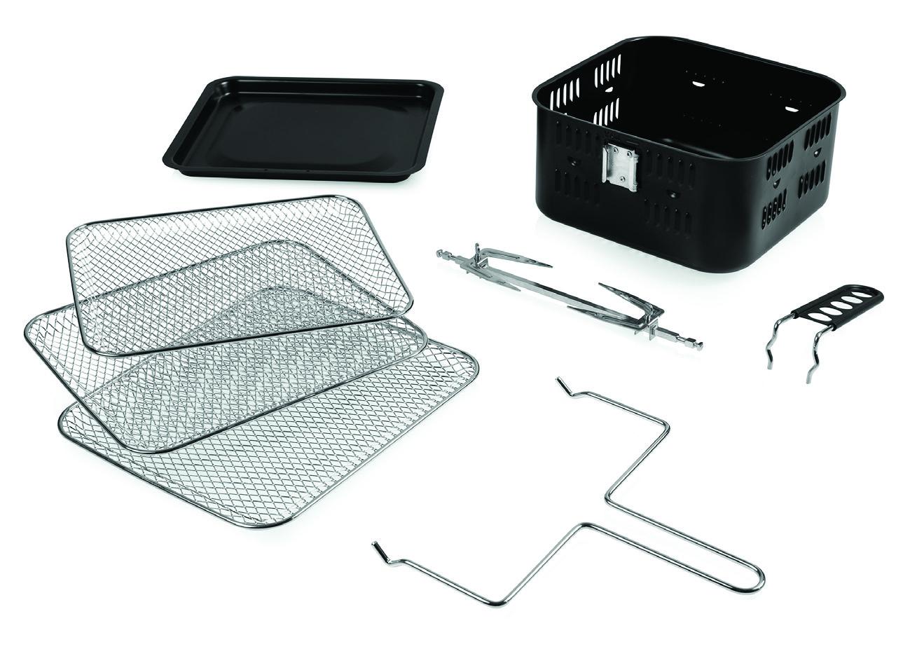 | Accesorii | Cos pentru gatire Rafturi pentru preparare cu aer cald, 3 buc Tija rotisor Maner pentru rotisor Tava pentru scurgerea uleiului |