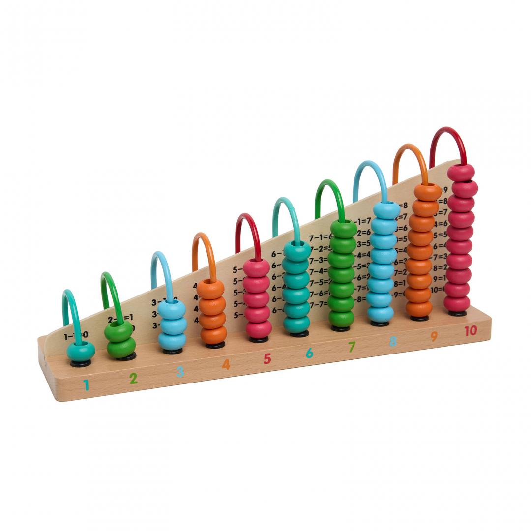 Ajuta la dezvoltarea memoriei, mentine atentia si oferta sprijin in operatiile matematice de adunare si scadere scrise pe panoul din lemn fata-verso.