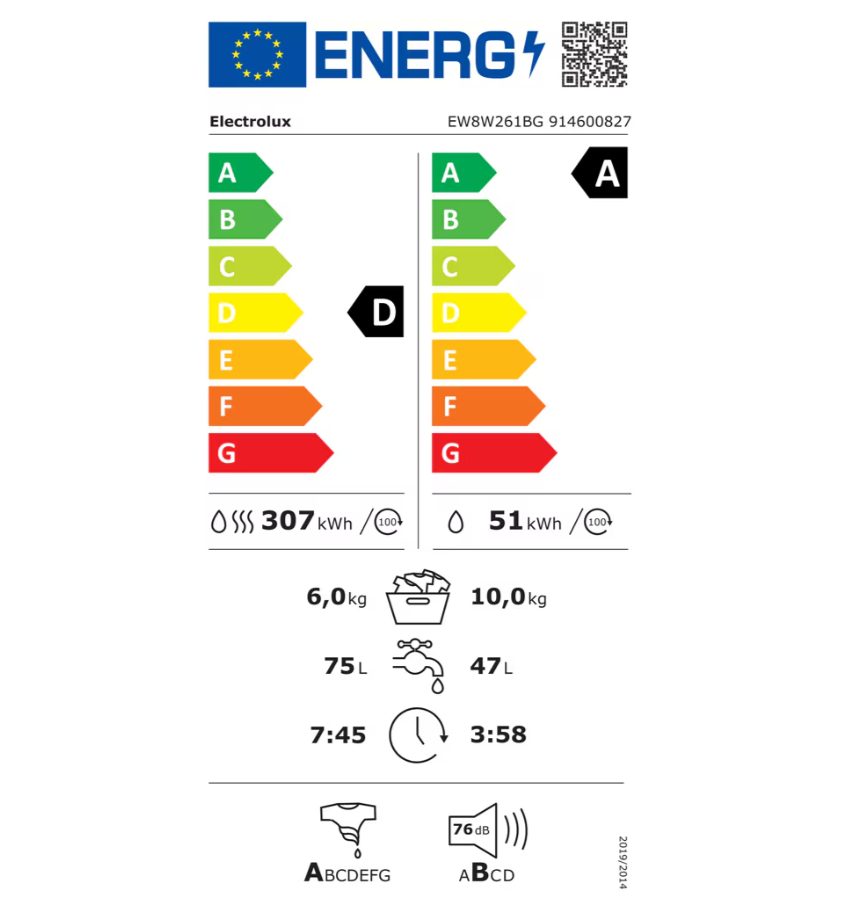 Mașină de spălat cu uscător PerfectCare800 EW8W261BG, Capacitate ciclu spălare: 10 kg, Capacitate ciclu spălare & uscare: 6 kg, Viteză max. centrifugare: 1551 rpm, Clasă eficienţă energetică – spălare & uscare: D, Clasă eficienţă energetică – spălare: A, Culoare: Negru