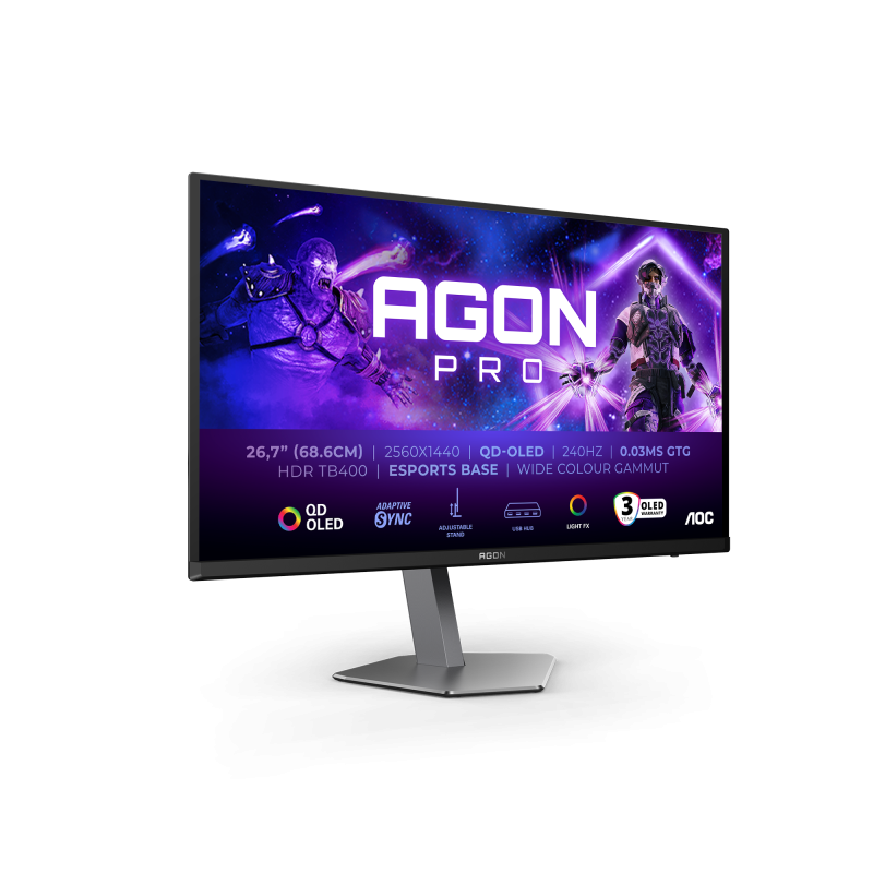 Monitor AOC 26.7″ AG276QZD2, Diagonal (inch): 26.7, Diagonal (cm): 68, Aspect ratio: 16:9, Panel: QD-OLED, Resolution: 2560×1440, Refresh Rate: 240Hz, Response time GtG: 0.03ms, Brightness (max): 1000 cd/m², Contrast (static) : 1.5M:1, Viewing angle: 178/178, Color Gamut Type: DCI-P3, Color Gamut Coverage: 99.1%, Colours: 1.07B, Speakers: 5Wx2, VESA Wallmount: 100×100, Tilt: -5/+25, HAS: 130mm, Pivot: Yes, Swivel: -30/30, HDMI: x2, DisplayPort: x2, USB Hub: x2 USB-A 3.2, AUX: x1 3.5mm Audio OUT