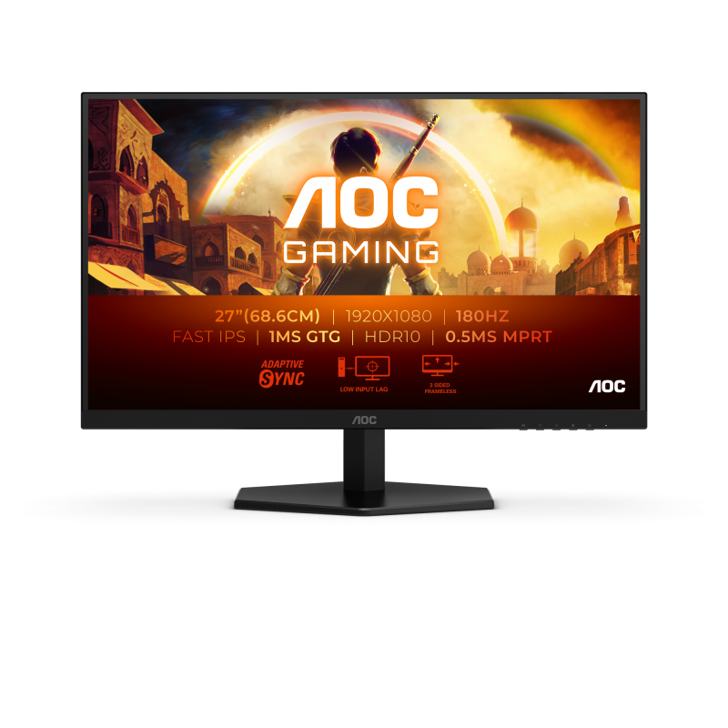 Monitor AOC 27″ 27G42E, Diagonal (inch): 27, Diagonal (cm): 69, Aspect ratio: 16:9, Panel: IPS, Resolution: 1920×1080, Refresh Rate: 180Hz, Response time GtG: 1ms, Response time MPRT: 0.5ms, Brightness (max): 300 cd/m², Contrast (static) : 1000:1, Contrast (dynamic): 80M:1, Viewing angle: 178/178, Colours: 16.7M, VESA Wallmount: 100×100, Tilt: -5/+25, HDMI: x1, DisplayPort: x1, AUX: x1 3.5mm Audio OUT