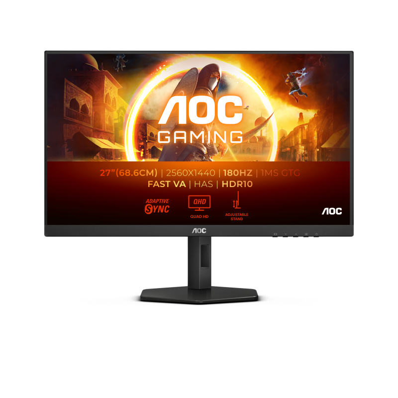 Monitor AOC 27″ Q27G4XN, Diagonal (inch): 27, Diagonal (cm): 69, Aspect ratio: 16:9, Panel: VA, Resolution: 2560×1440, Refresh Rate: 180Hz, Response time GtG: 1ms, Response time MPRT: 0.5ms, Brightness (max): 300 cd/m², Contrast (static) : 5000:1, Contrast (dynamic): 80M:1, Viewing angle: 178/178, Colours: 16.7M, VESA Wallmount: 100×100, Tilt: -5/25, HAS: 130mm, Pivot: Yes, Swivel: -30/30, HDMI: x2, DisplayPort: x1, AUX: x1 3.5mm Audio OUT