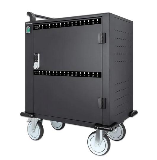 Statie de incarcare Manhattan 716000 pentru tablete si telefoane cu display de pana la 12″, suporta pana la 32 de dispozitive, tip port USB- C PD, putere totala 576W, 18W per port, sistem de securizare cu cod PIN, cu protectie la supratensiune, ventilatie silentioasa, carcasa de metal, negru. Nu contine cablul de alimentare si alte cabluri conexe.