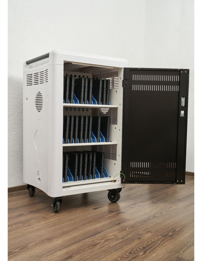 Statie de incarcare CART36, suporta maxim 36 de dispozitive cu diagonala de pana la 15.6″, dimensiune slot dispozitiv 2.65 x 39.5 x 26.5 cm, dimensiunea statie 65 x 60 x 113 cm, indicator LED pentru starea de incarcare, multi-function power management, zona dedicata pentru cable management, 2 manere pentru manevrare si mecanism de inchidere pentru usi in 3 puncte, orificii ventilatie pentru panourile din fata/spate
