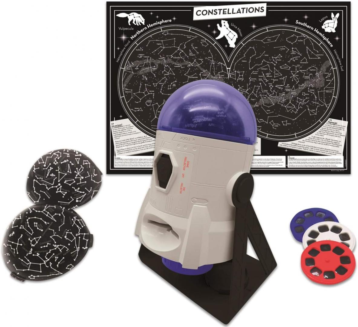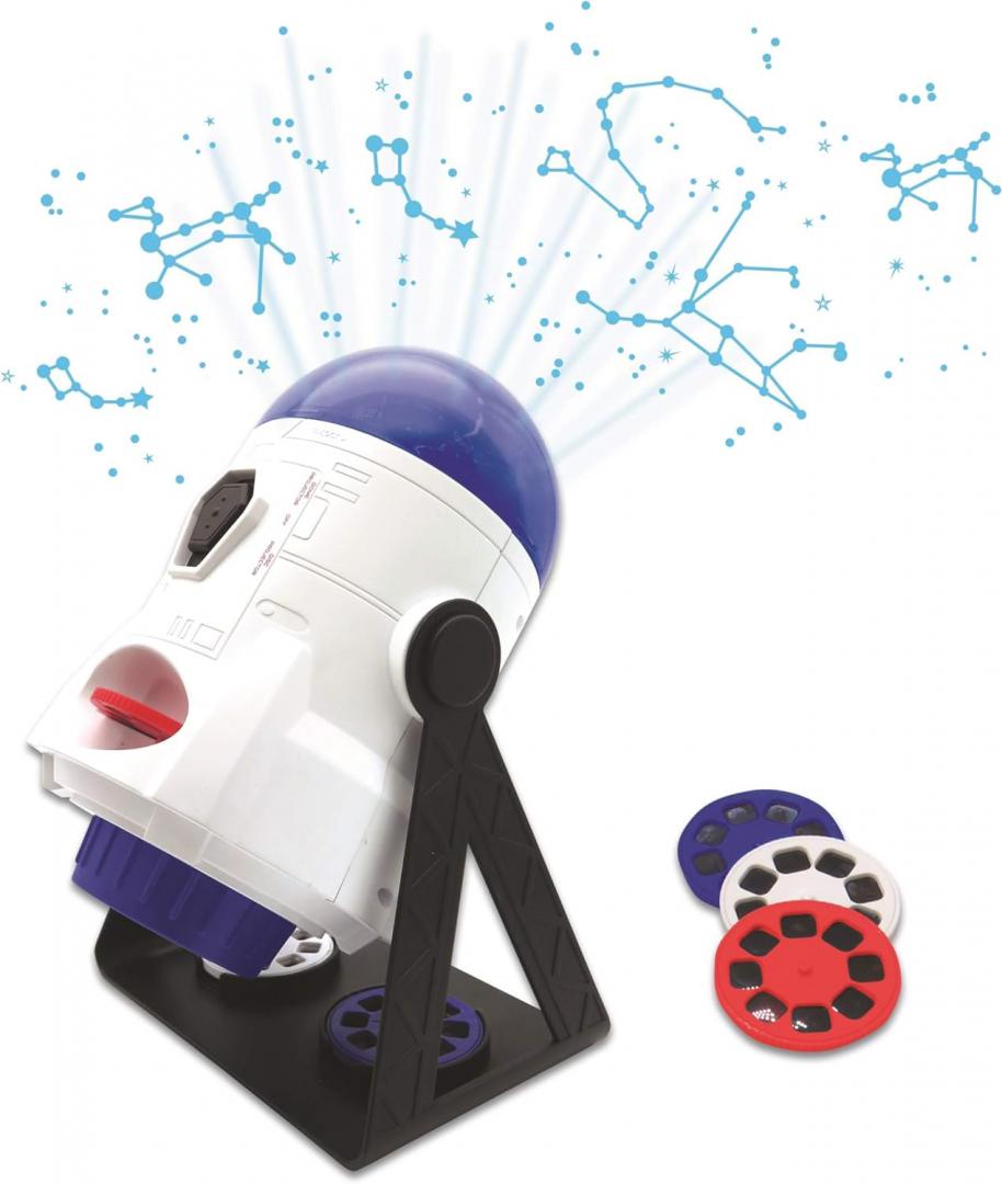 | Planetariu distractiv și educativ pentru descoperirea stelelor și planetelor! Include o hartă a constelațiilor și 24 de imagini cu nave spațiale, planete, nebuloase, luni, galaxii și altele. Copiii vor fi încântați să descopere secretele universului direct în camera lor! Proiecția motorizată la 360° transformă tavanul camerei copiilor într-un adevărat spectacol de stele! Acest planetariu distractiv cu 2 cupole interschimbabile pentru proiectarea constelațiilor și învățarea numelor acestora și 3 discuri interschimbabile cu 24 de imagini ale navelor spațiale, primilor pași pe Lună, planetelor, nebuloaselor și galaxiilor transformă camera într-o experiență vizuală plină de misterele universului. Proiecția funcționează pe majoritatea suprafețelor. Imaginile minunate ale galaxiilor și constelațiilor pot fi proiectate pe perete, pe tavan sau chiar pe un ecran de proiecție. Pentru a schimba imaginea, este suficient să rotiți discul și claritatea este reglabilă datorită inelului de focalizare. Copiii vor fi încântați de proiecția scenei stelare direct în camera lor. Proiectorul este alimentat de trei baterii de 1,5 V baterii tip AA/LR6 (nu sunt incluse în pachet). |