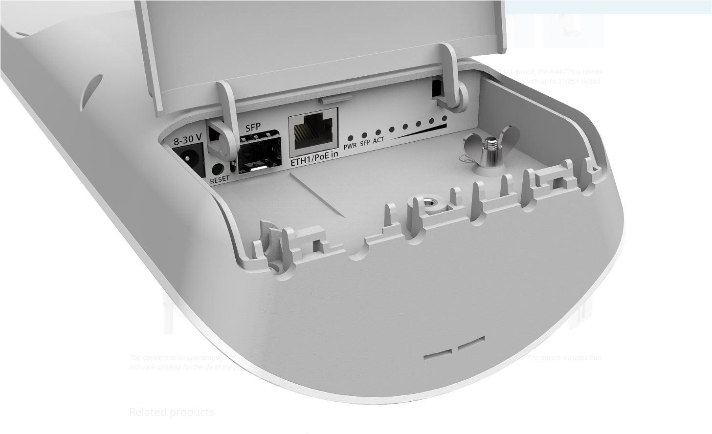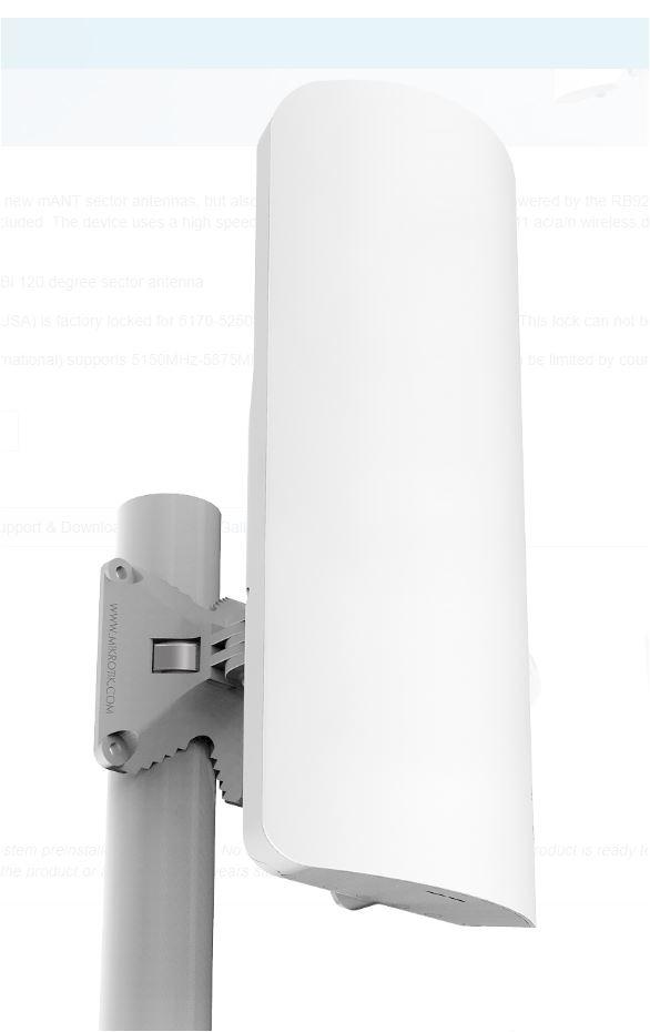 Mikrotik Antena externa 15dBi, 120 grade + router wireless integrat, CPU: 720Mhz, Ram: 128 Mb, dimensiuni: 140 x 348 x 82 mm, Passive POE, viteza wireless 5Ghz 867 Mbit/s, tehnologie: Wi-Fi 5, 1 x 10/100/1000, 1 x SFP.