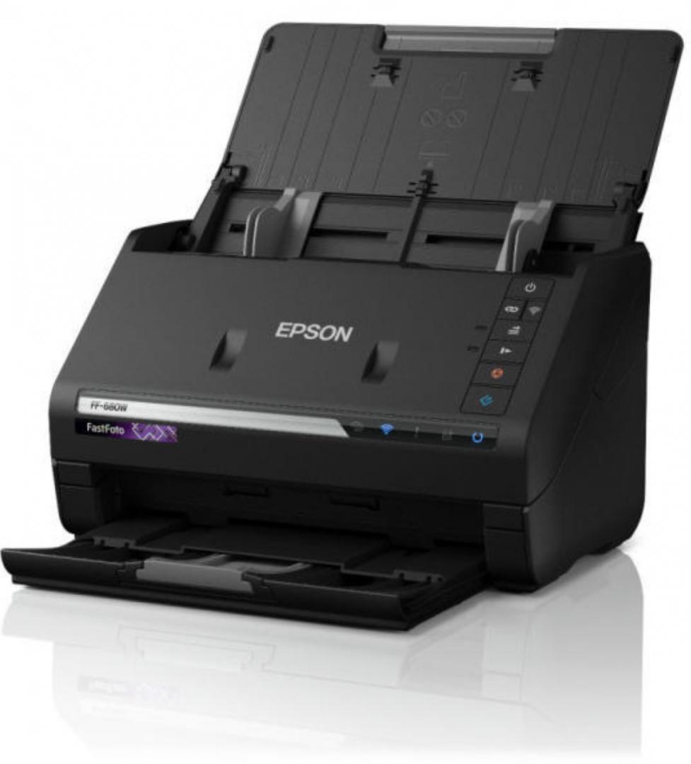 Scanner Epson FASTFOTO FF-680W, dimensiune A4, tip sheetfed, viteza scanare: 46ppm alb-negru si color, rezolutie optica 6400x9600dpi, senzor CIS, Duplex, software : Epson ScanSmart, Formate iesire: JPEG, TIFF, PDF, searchable PDF, PDF/A, interfata: USB 3.0, Wireless LAN IEEE 802.11b/g/n (WiFi 4), Dimensiuni: 296‎ x 169 x 176 mm (Latime x Adancime x Inaltime), Greutate: 3.7 Kg.