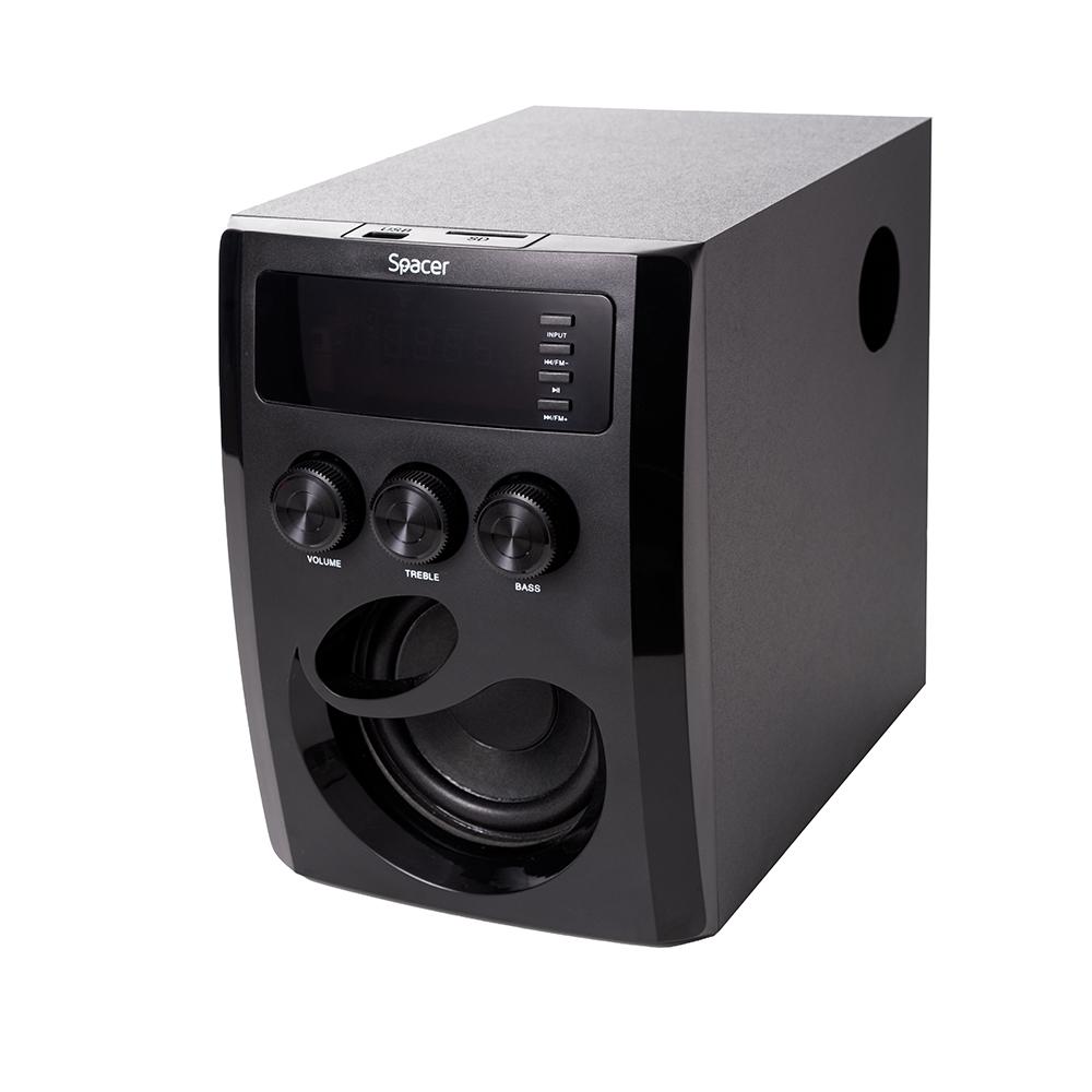 BOXE SPACER 2.1, RMS: 20W (2 x 5W + 10W), bluetooth telecomanda wireless, control volum, bass, treble, subwoofer lemn MDF, 220V, radio FM, SD card, port USB, RCA, negru