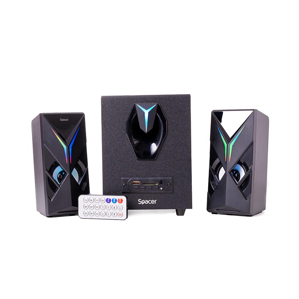 Boxe Spacer Gaming 2.1, 14W RMS ( 2x3W + 8W), bluetooth, telecomanda wireless, control volum, subwoofer lemn MDF, 220V alimentare, USB/SD/AUX/radio FM, negru