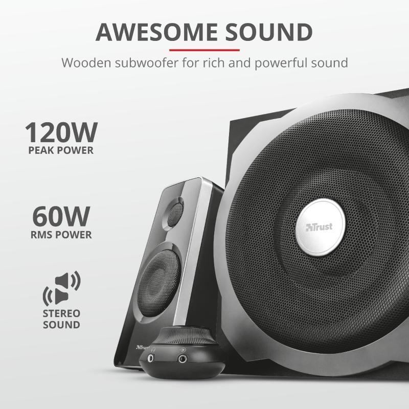 Boxe Trust Tytan 2.1, lungime cablu audio 175 cm, intrare audio 3.5 mm, frecventa raspuns 20 Hz, 20.000 Hz, putere maxiam RMS 120 W, impendanta 4 Ohm, negru